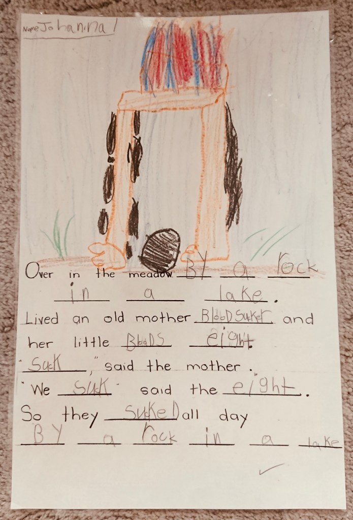 My favourite artwork from my early years was a little fill in the blank poem and drawing that I did in Grade 1. We could choose any animal to write our poem about. Most of the other kids chose cute, fluffy animals. Puppies, kittens, and I remember tigers as well. So, was my poetry subject an endearing, cuddle-worthy creature? Far from it! Little weirdo that I was, I chose bloodsuckers.